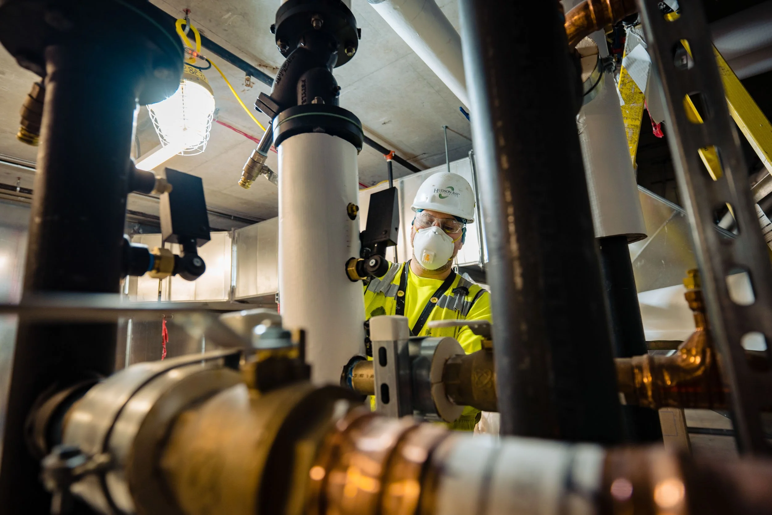 A technician installing the insulation around piping in a commercial building. There are so many parts of construction that most people (me) don’t think about before they need it or see it.