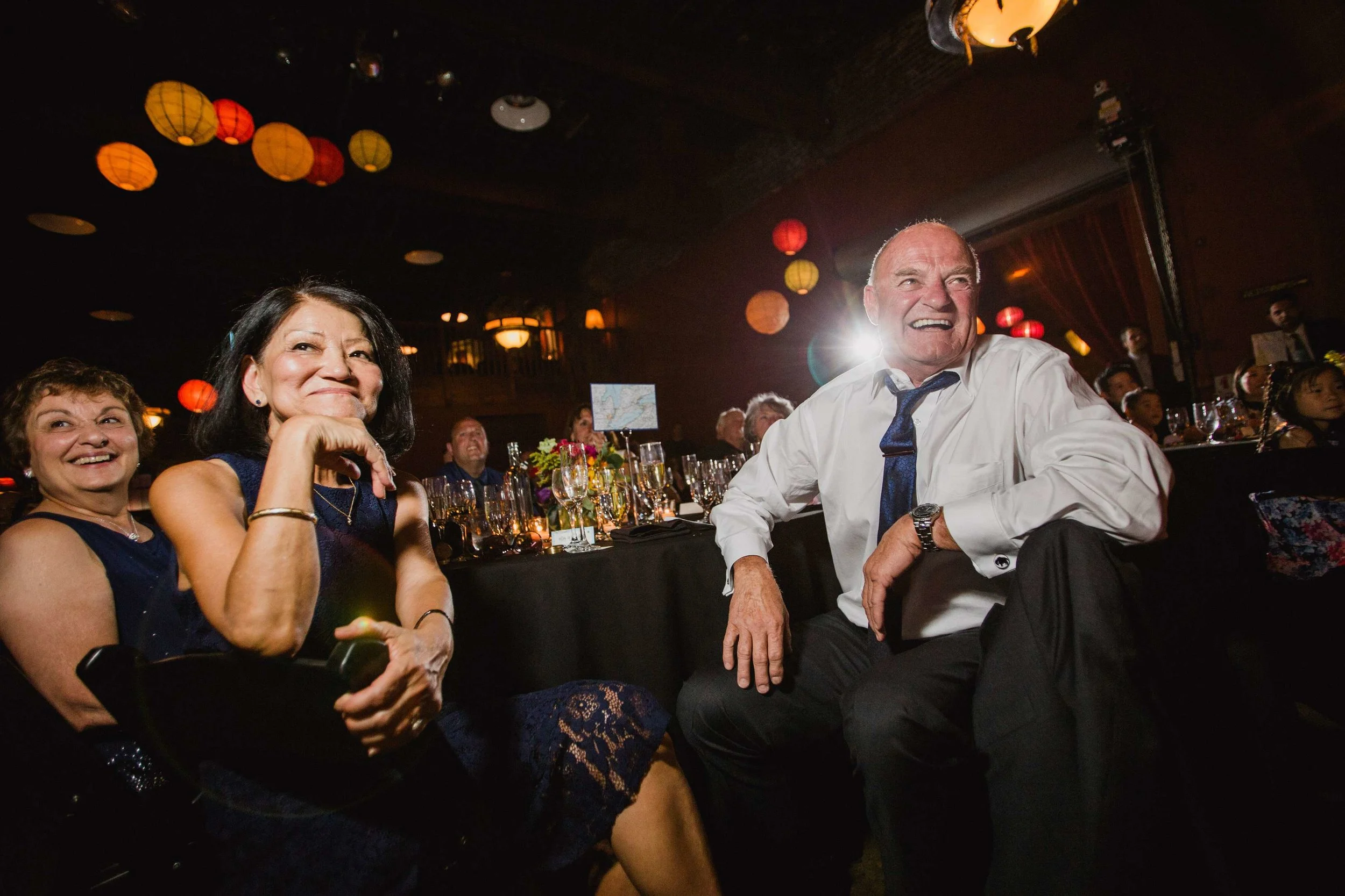 Guests laughing at wedding reception